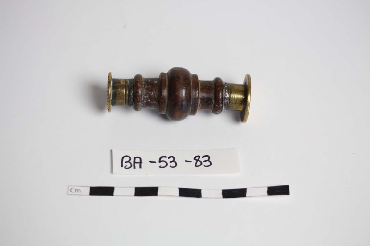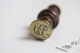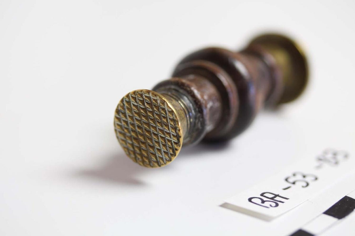 Signet með stafina BJ öðru megin og renndur sem mynda litla tígla á hinum endanum. Endarnir eru úr CO/AU og hafa dottið af og verið límdir á aftur. Annar er enn laus. Handfangið er úr við og er rennt.
