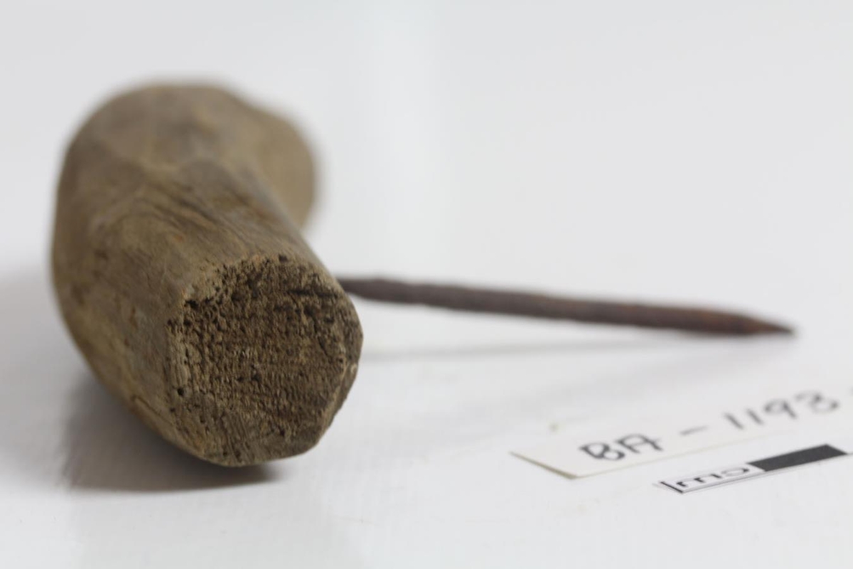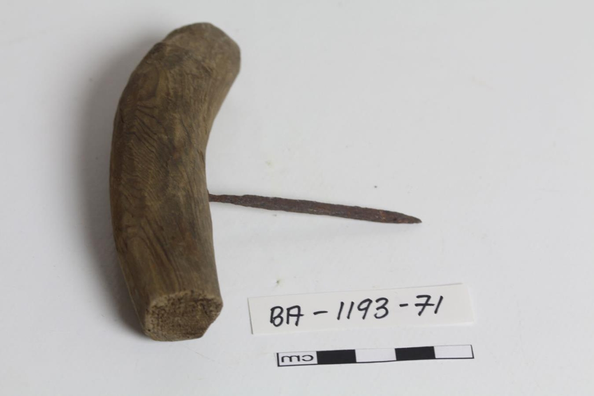 Handfangið gengur þvert á járntein, teinninn er mjög riðgaður.