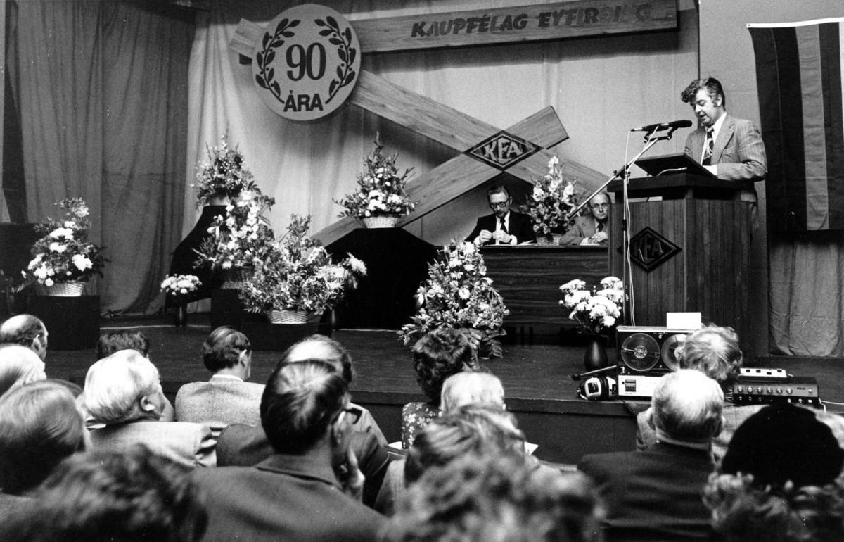 Níutíu ára afmæli KEA. Bjarni Einarsson bæjarstjóri í ræðustól.