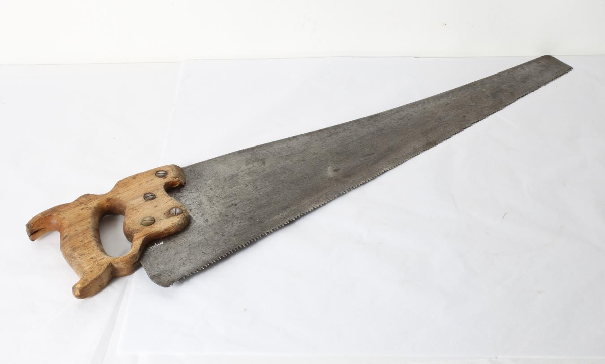 Gömul handsög með viðarhaldi. Notuð til að saga timbur. Framleiðandi: Disston, U.S.A.