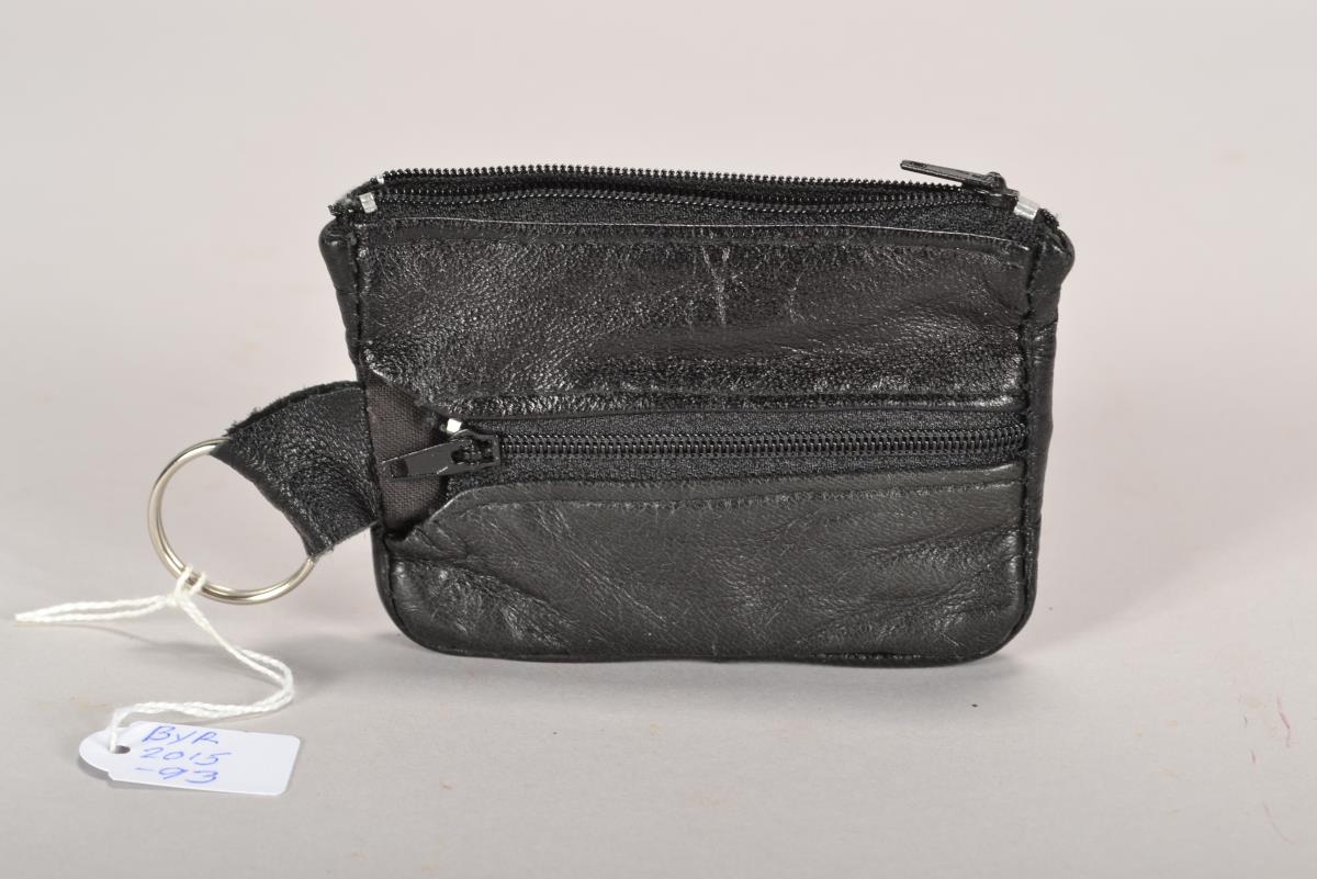 Svört leðurbudda fyrir lykla og smámynt merkt „Sparisjóðurinn“