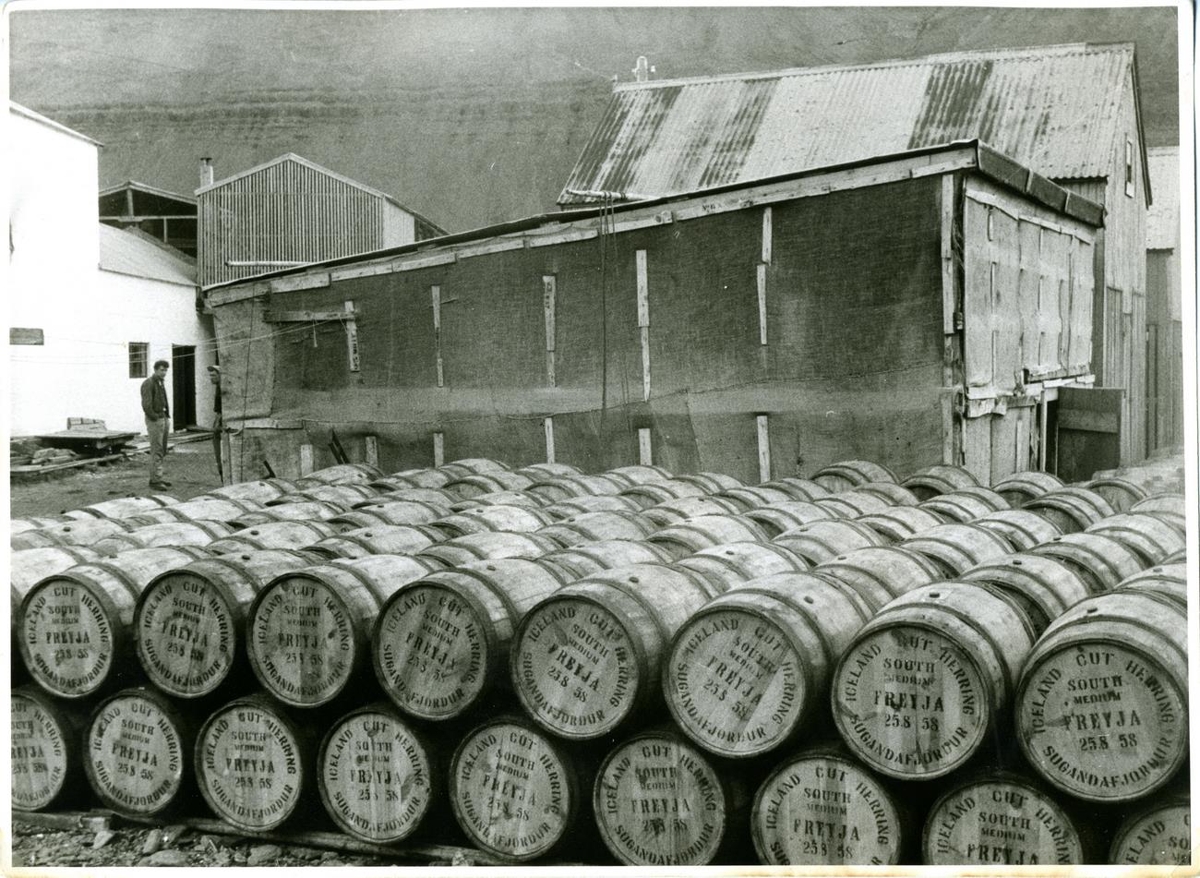 Síldartunnur merktar „Freyja Súgandafjörður“ liggja og bíða flutnings. Tjörupappaklæddur skúr og svo aðrar byggingar í baksýn. Tveir karlmenn standa við skúrhornið og ræða saman. Á bakhlið er stimpill ljósmyndara.