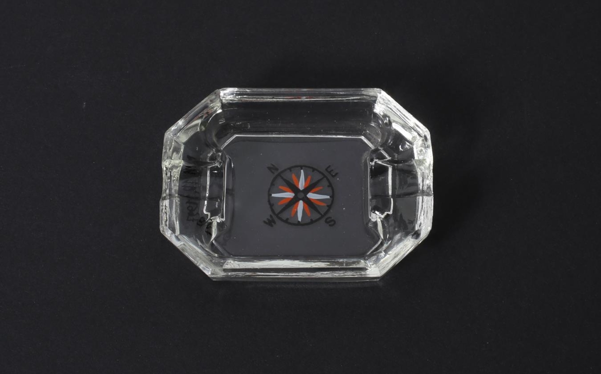 Lítill glær gleröskubakki, skreyttur í botni með áttunum fjórum á ensku; W + S + N + E. Úr dánarbúi Jónasar Péturssonar Lagarfelli, Fellabæ.