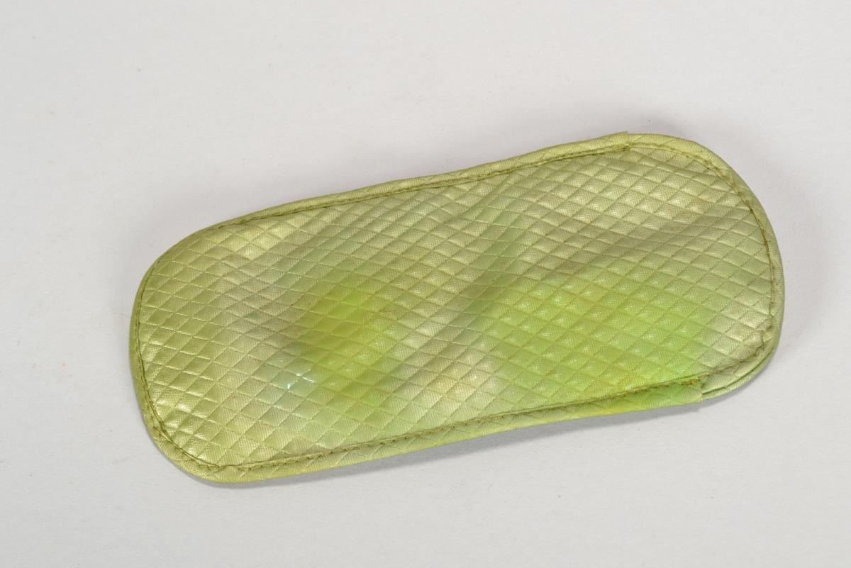 Gleraugnahulstur úr grænu plastefni með frekar mattri áferð, orðið smá upplitað öðru megin, fóðrað með hvítu lérefti.