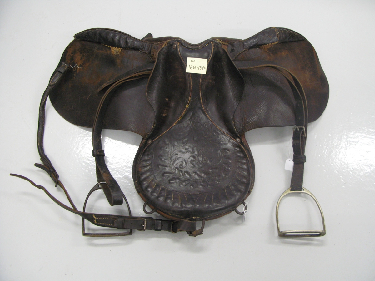 Hnakkur, svartur, stunginn í mynstur í sessu. Með ístöðum og reiða. Dálítið rifinn, fallegur en harður. Setan er stungin með blaðamunstri og bryddingarnar framaná löfunum eru rifnar og sprungnar. Var í kistu, grænni ásamt einhverjum hlutum úr Breiðdal. Kistan máluð með rósaverki framan á og rauðu loki, kúptu. Handföng á báðum hliðum.