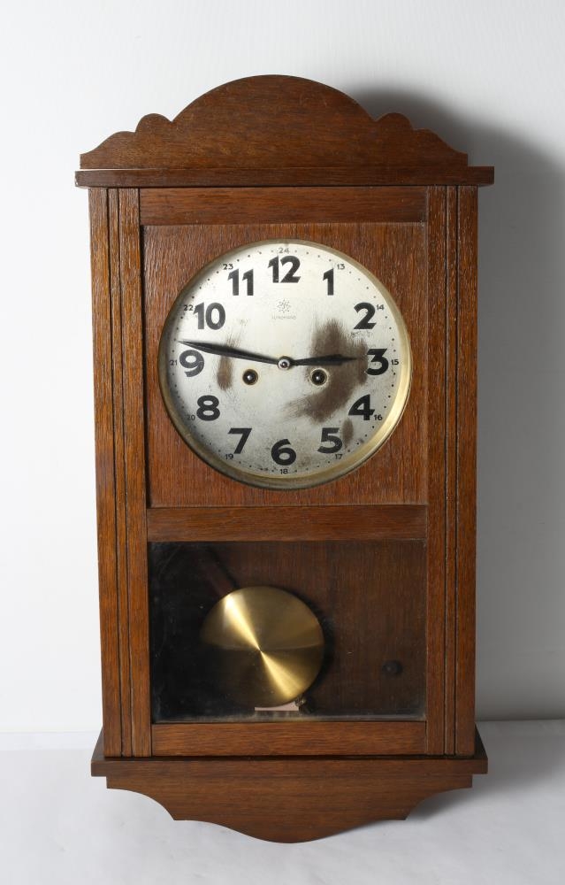 Brún klukka til að hengja á vegg. Úr búi gefanda og manns hennar Sigurðar Guttormssonar á Hallormsstað.