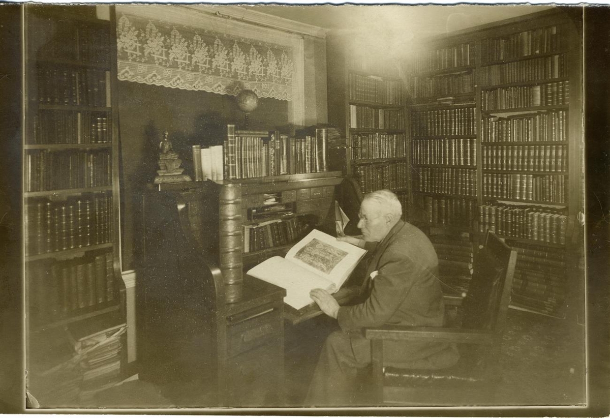 Benedikt S. Þórarinsson kaupmaður og bókasafnari í bókasafninu á heimili sínu. Á bakhleið er skrifað: Benedikt Þórarinsson bókasafnsri.