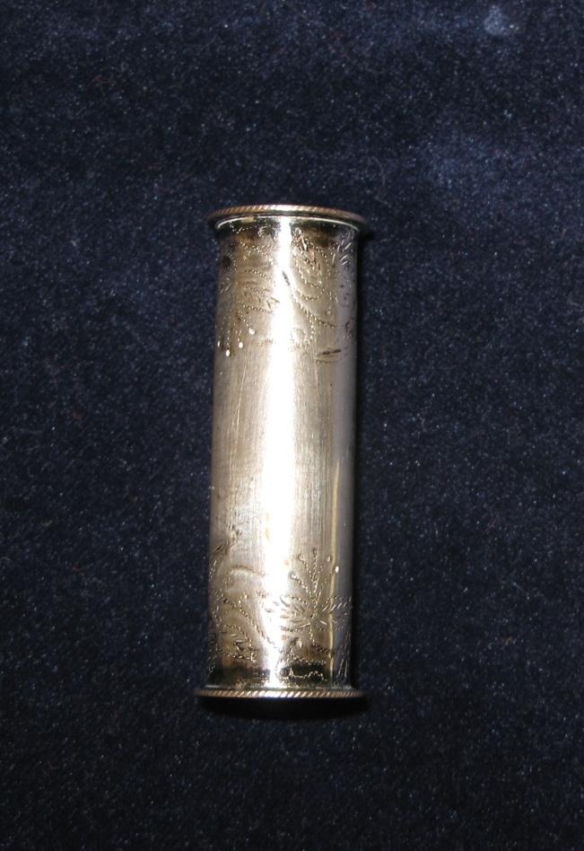 Silfurhólkur sléttur en ágrafið laufa- og blómamunstur til hvors enda, mikið máð. Aðeins smá lögg á hvorum enda.