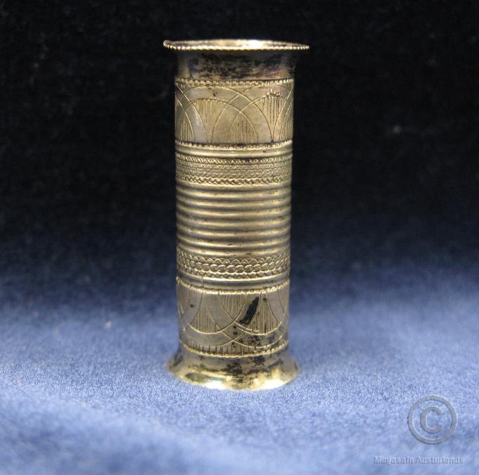 Skotthúfuhólkur úr silfri með bárum í miðju og fallegu flúri til endanna. Frá Sigurði Einarssyni Keldhólum Völlum