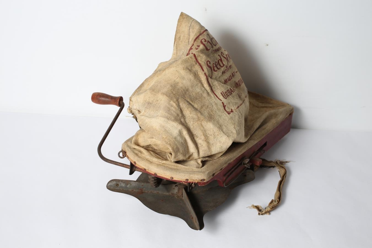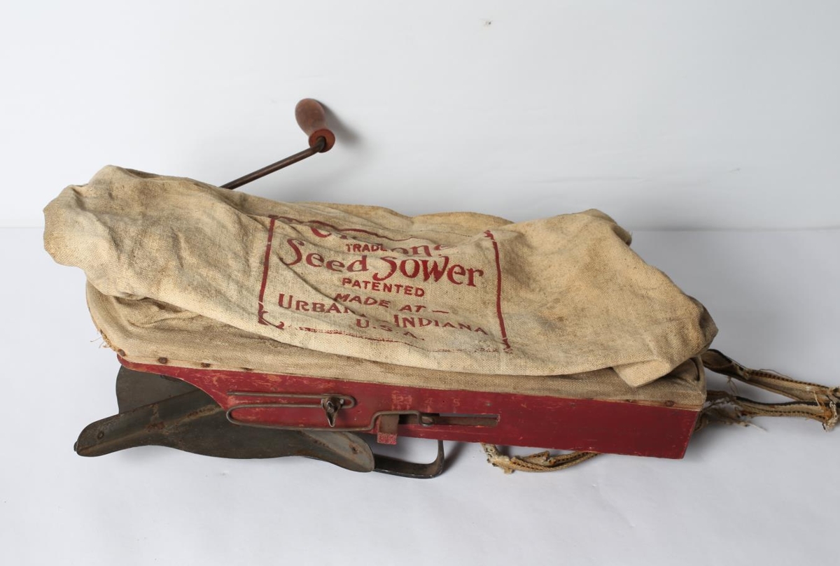 Notaður til að sá rófnafræjum. Samsettur úr ljósleitum strigapoka með þykkri, rauðmálaðri tréfjöl og sveif með tannhjólum og spöðum úr járni og blikki. Með handfangi til að halda á pokanum. Á pokanum stendur með rauðum stöfum "Cyclone" Trade mark Seed Sower patented Made at Rabana - Indiana U.S.A. Úr búi Sveins og Sigríðar Fanneyjar.