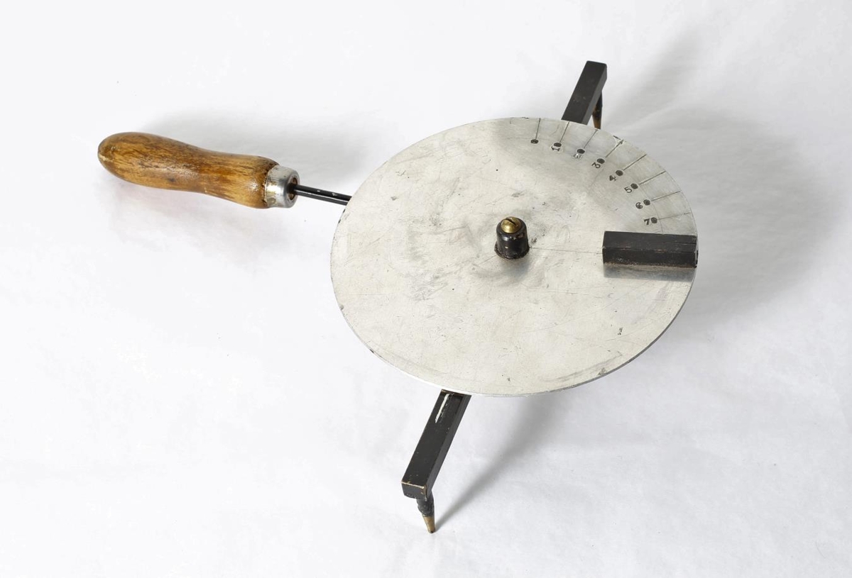 Skífa með tölum á, úr járni með viðarskefti. Líklega notað til hallamælinga. Úr dánarbúi Gunnars Þorsteinssonar og Önnu Sigfinnsdóttur, Fossgerði.