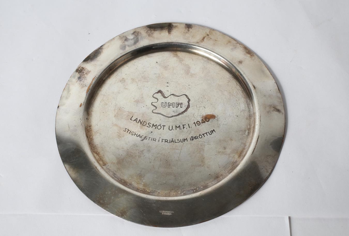 Silfurdiskur með skornu Íslandi með UMFÍ. Landsmót UMFÍ 1940. Verðlaunagripur frá landsmóti UMFÍ 1940. ÚÍA vann gripinn með því að vera stigahæstir í frjálsum íþróttum á mótinu.