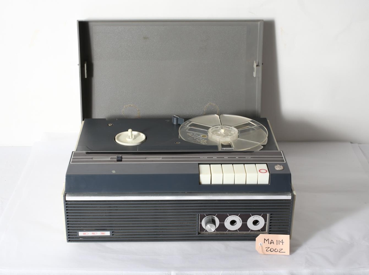 Segulbandstæki af gerðinni "Sony Type 7". Framleitt í Japan. Vantar annan segulbandshringinn. Úr ljós- og dökkgráu plasti. Úr eigu Þorbjargar Bergsteinsdóttur.
