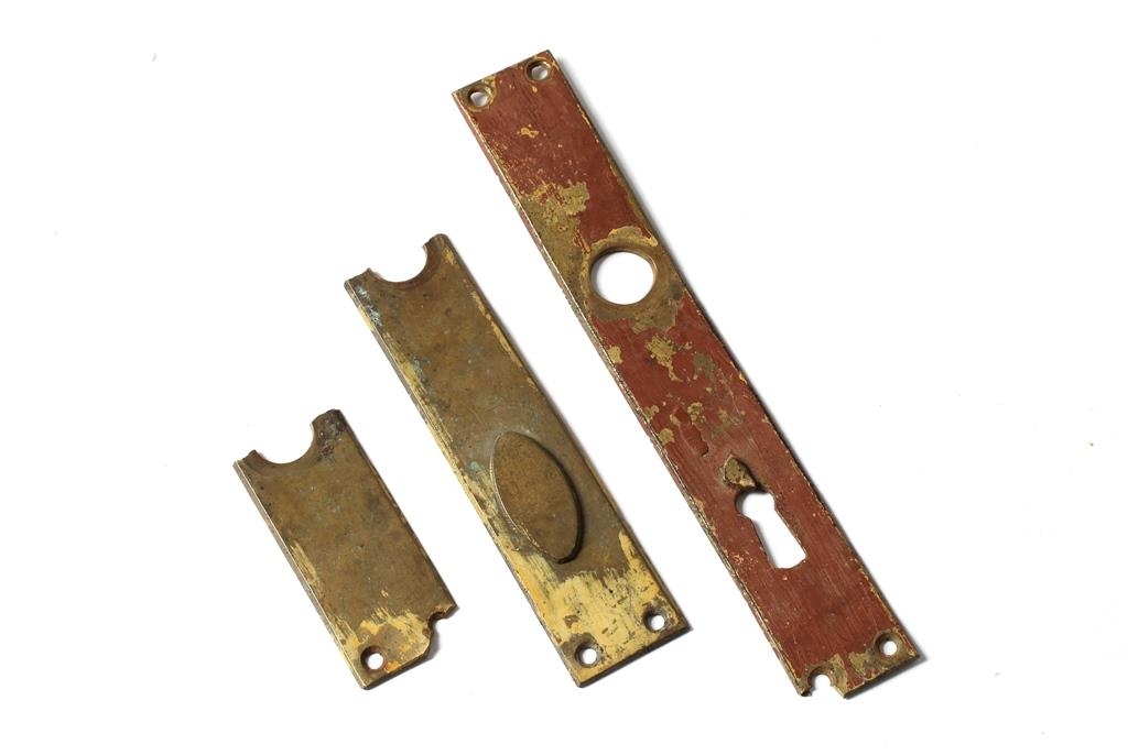 Koparplata, brotin í sundur við snerilgatið. Skráargat með plötu yfir, platan er aðeins lituð af gulri málningu. Gefandi hirti við bæinn Gröf í Eiðaþinghá.