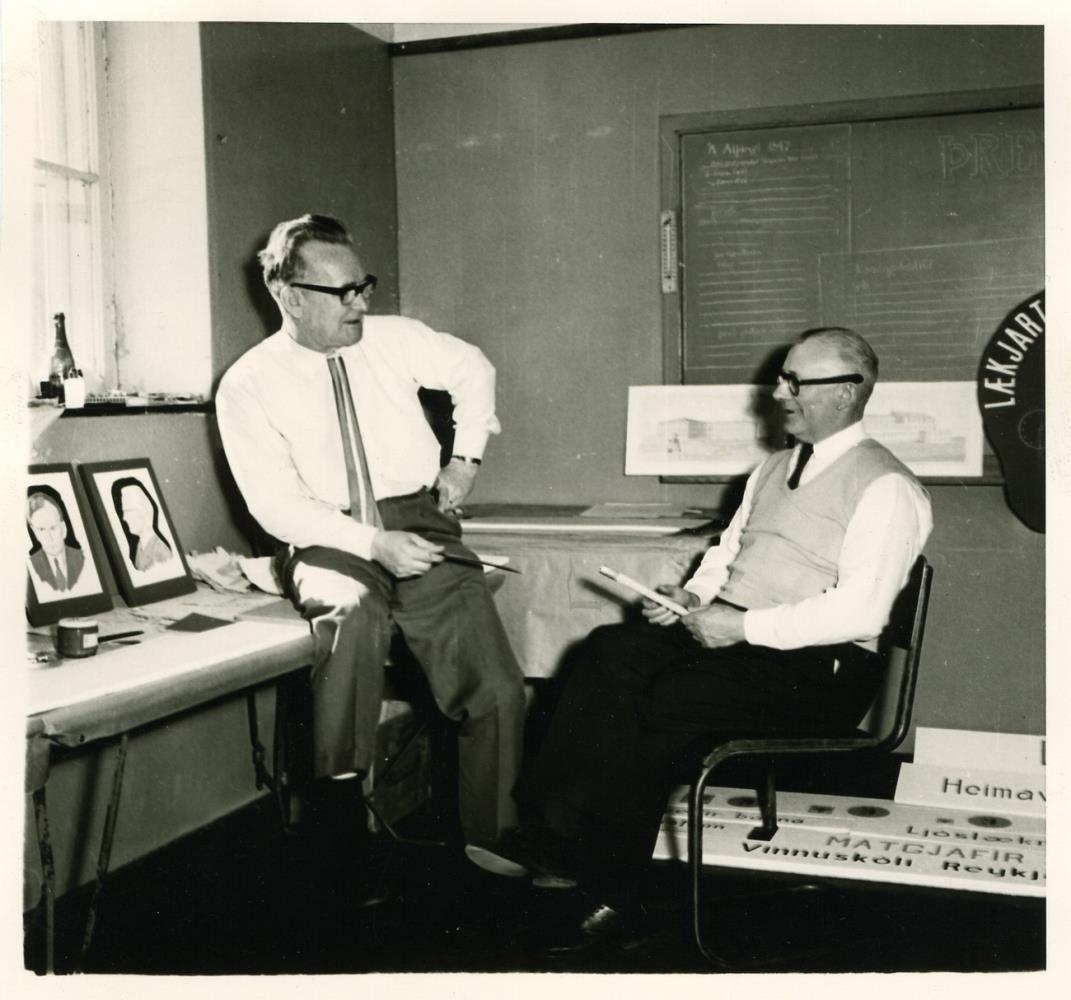 Unnið að gerð sýningar um 100 ára skólahald í Reykjavík árið 1962. Á bakhlið er skrifað: Eggert (Guðmundsson), Gunnar M. Magnúss..