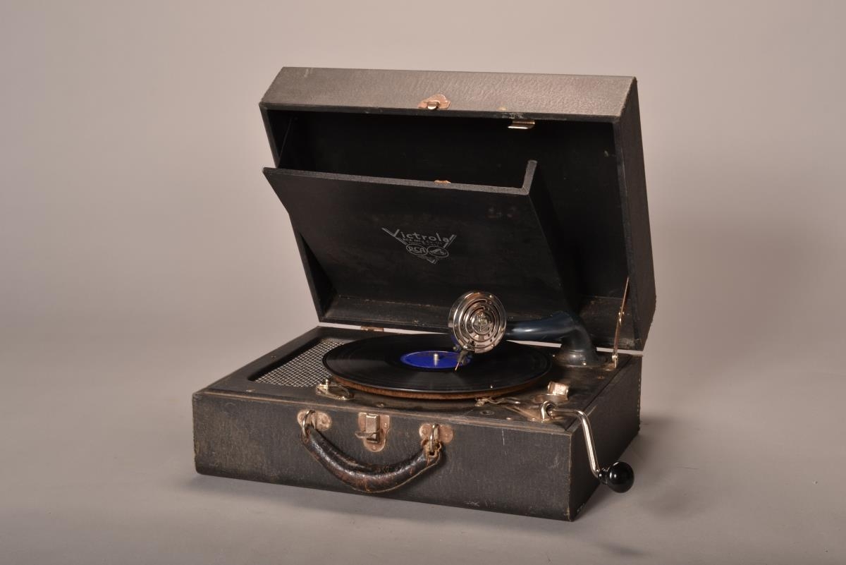 Plötuspilari í svörtum viðarkassa með leðurhandfangi.