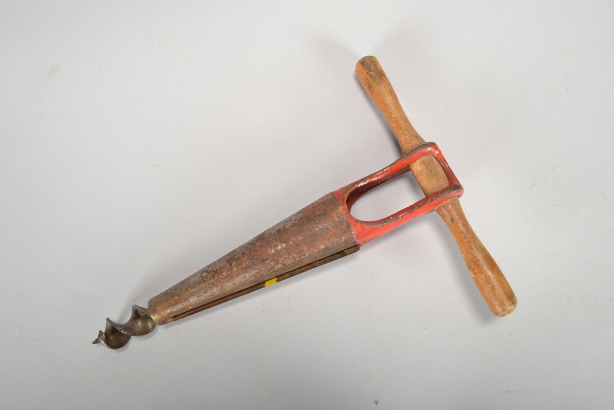 Hulsubor. Hol hulsa úr málmi sem mjókkar fram, með bitegg á hliðinni og borstykki fremst. Handfang úr timbri.