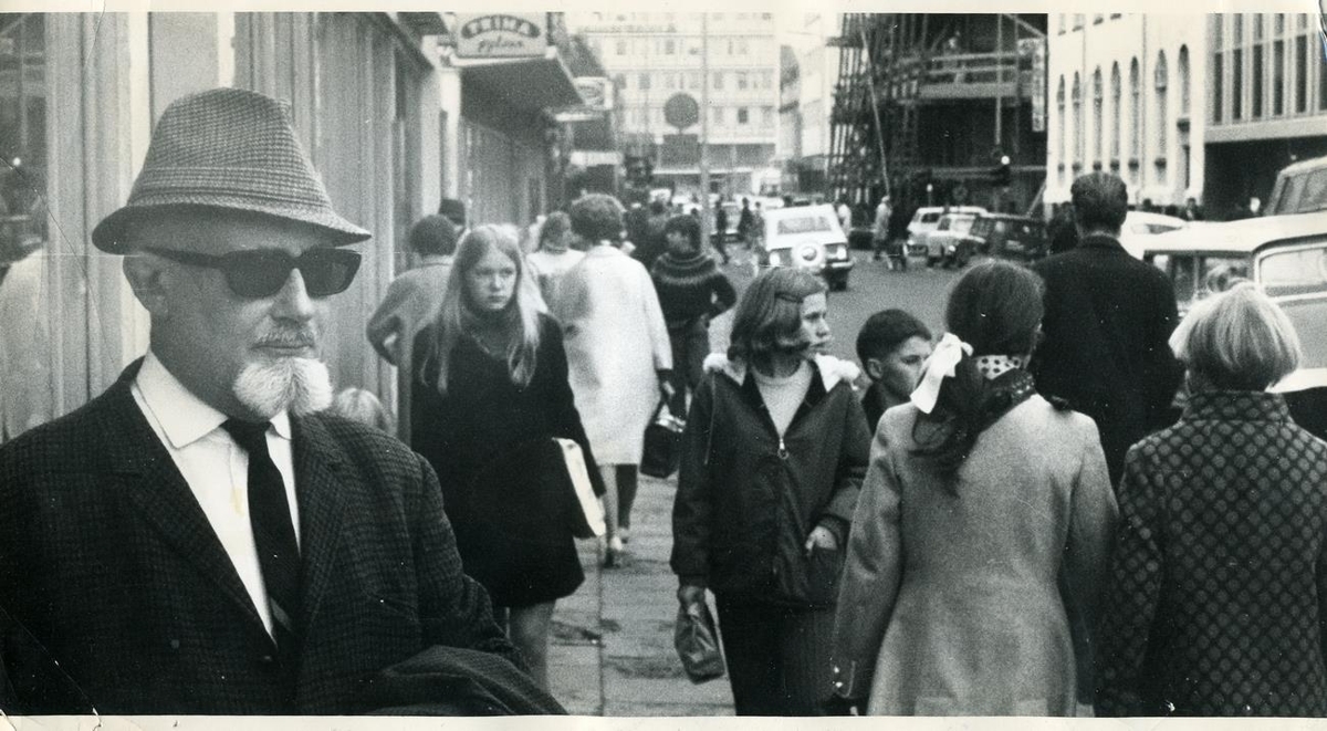 Gunnar M. Magnúss rithöfundur í Austurstræti. Á bakhlið er skrifað: 17. sept. 1968. Sigurjón Jóhannsson blaðam. Alþbl. tók.