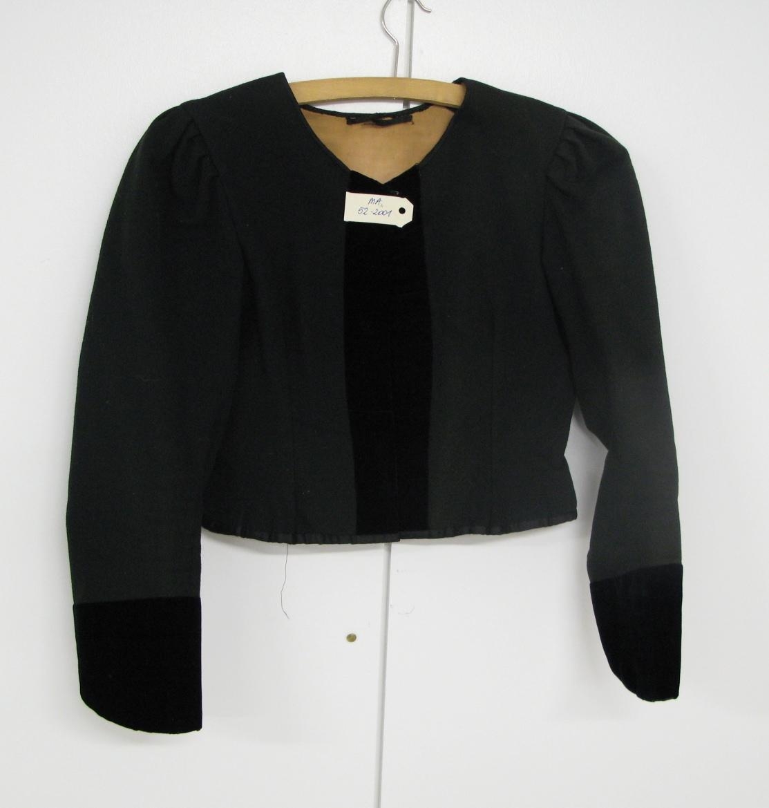 Svart efni. Flauel og eitthvað annað, líklega klæði. Úr eigu Bjargar Steinsdóttur. Björg lærði fatasaum og átti treyjuna þegar hún var ung.