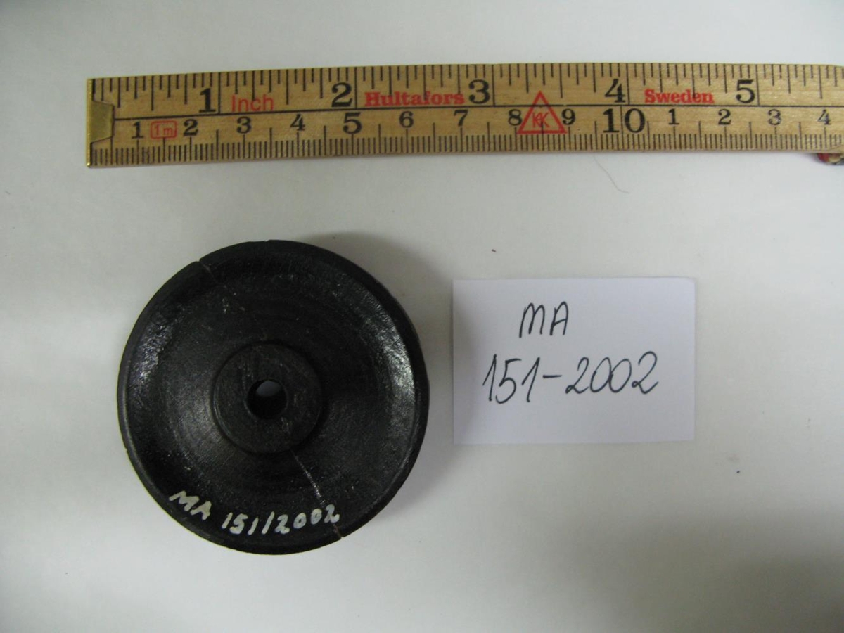 Lítill, mjög dökkur kringlóttur hlutur með gati í miðjunni og rauf á hliðinni. Hluturinn er dökkbrúnn og með einkennilegri áferð. Var brotinn þegar hann kom á safnið en var límdur saman af starfsfólki safnsins. Er trúlega úr rokk. Úr dánarbúi Sigmars Magnússonar.