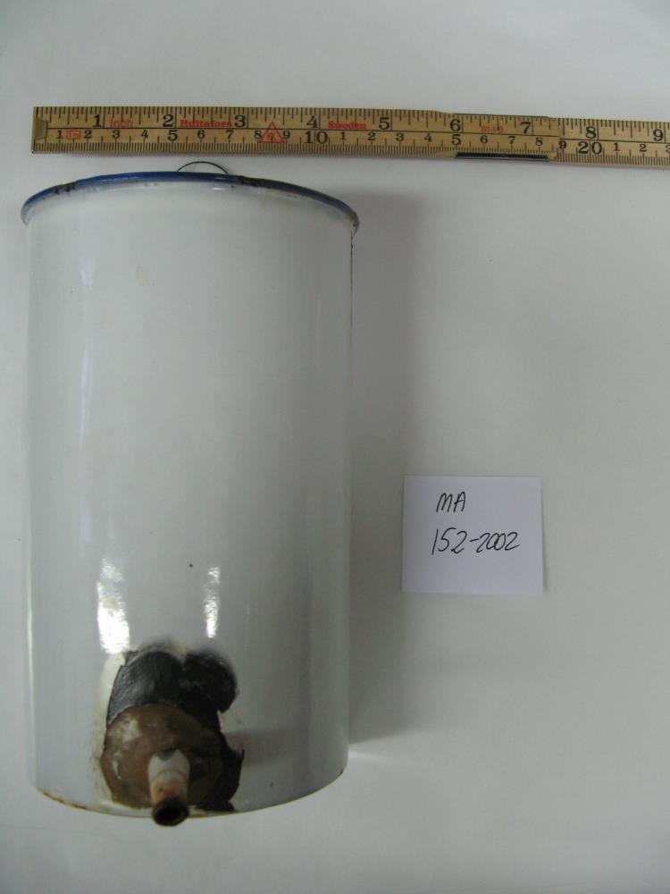 Stólpípa (MA-2002-152a): Hvít emeleruð með blárri rönd efst. Ein slétt hlið en efst á henni er lítil plata með gati. Hinumegin neðst er lítill stútur. Það hefur verið gert við hann þar sem hann tengist pípunni með brúnleitum leir?