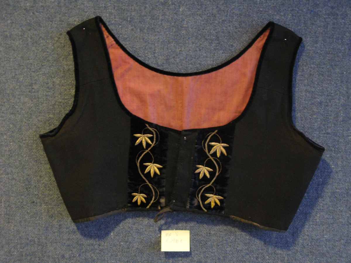 Svartur bolur. Bláir, balderaðir flauelsborðar af samfellu, fóðraður með vínrauðu klæði. Móðir gefanda, Guðríður Guttormsdóttir frá Stöð átti upphlutinn. Hún klippti borðana af samfellu þeirri, er Guðríður maddama (Sbr. MA-1981-4) gaf henni og notaði á upphlutinn. Þetta eru þeir síðustu sem hún fékk úr borðunum. Gefandi telur borðana balderaða.