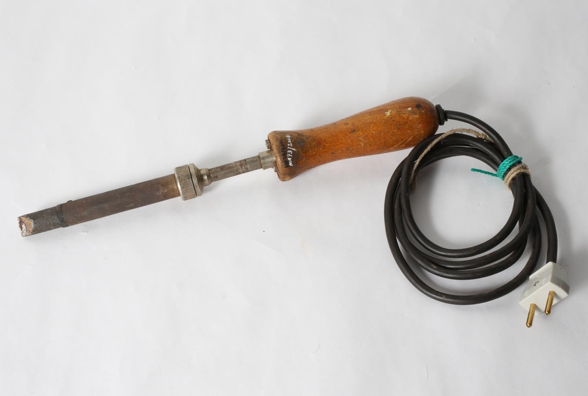 100 W. lóðbolti með lökkuðu tréskafti og svartri rafmagnssnúru. Til að sjóða e-ð saman með bræddum málmi. Var í eigu Guðmundar Björnssonar, húsasmiðs frá Múla í Álftafirði.