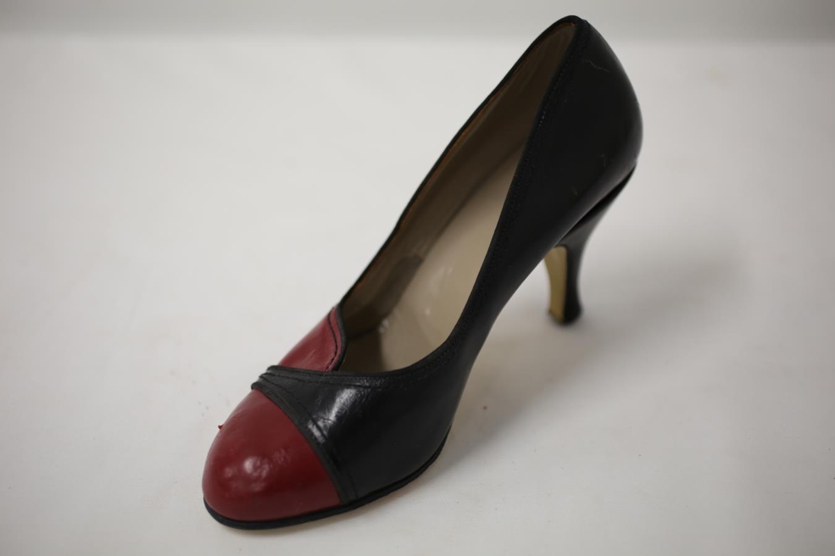 Tvílitur, svartur og rauður, háhælaður skór. Úr þrotabúi skóverksmiðjunnar Agilu Egilsstöðum er starfaði á árunum 1970-1975. Skórinn þó líklega ekki framleiddur í Agilu.