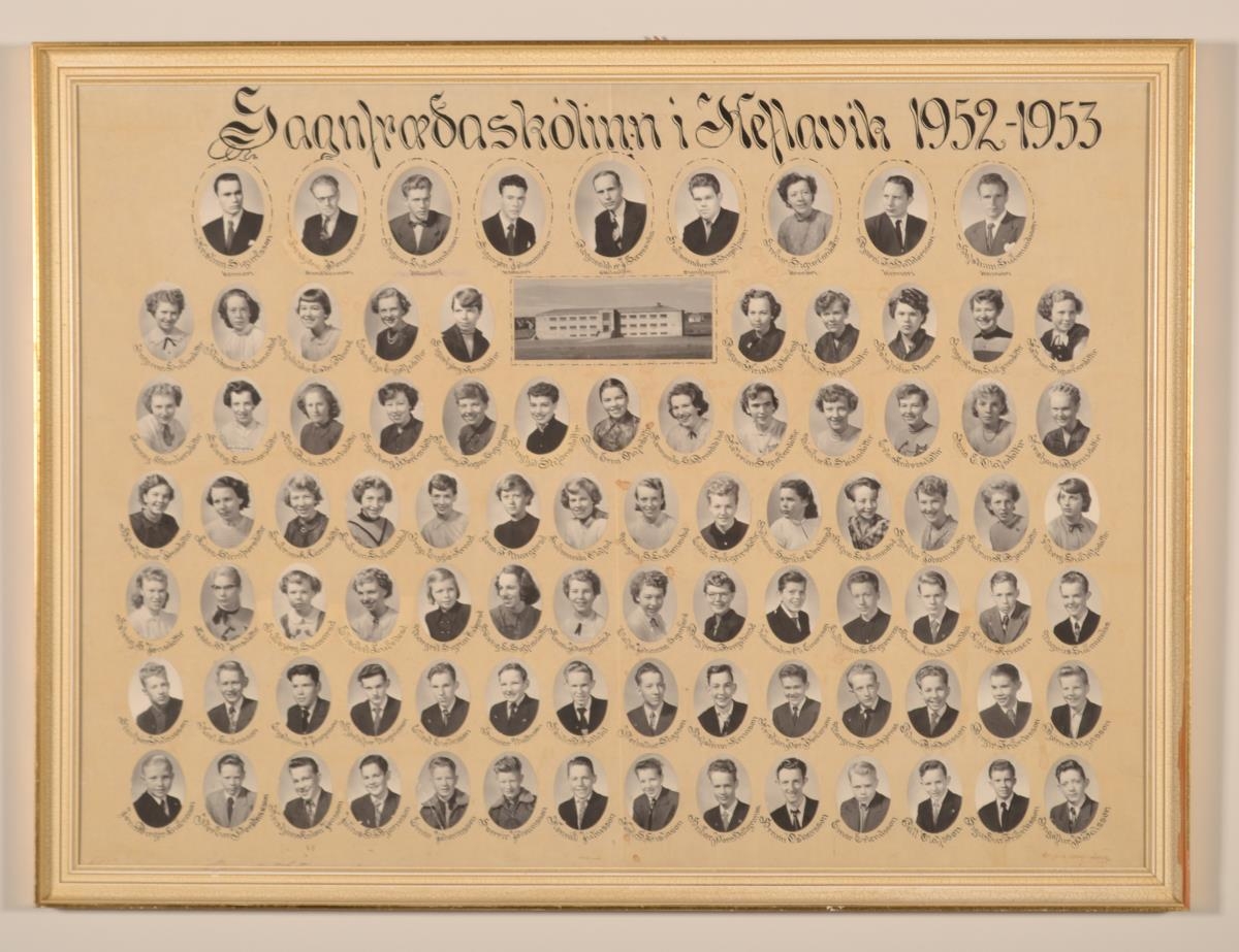 Innrammað skólaspjald frá Gagnfræðaskólanum í Keflavík árið 1952 til 1953.