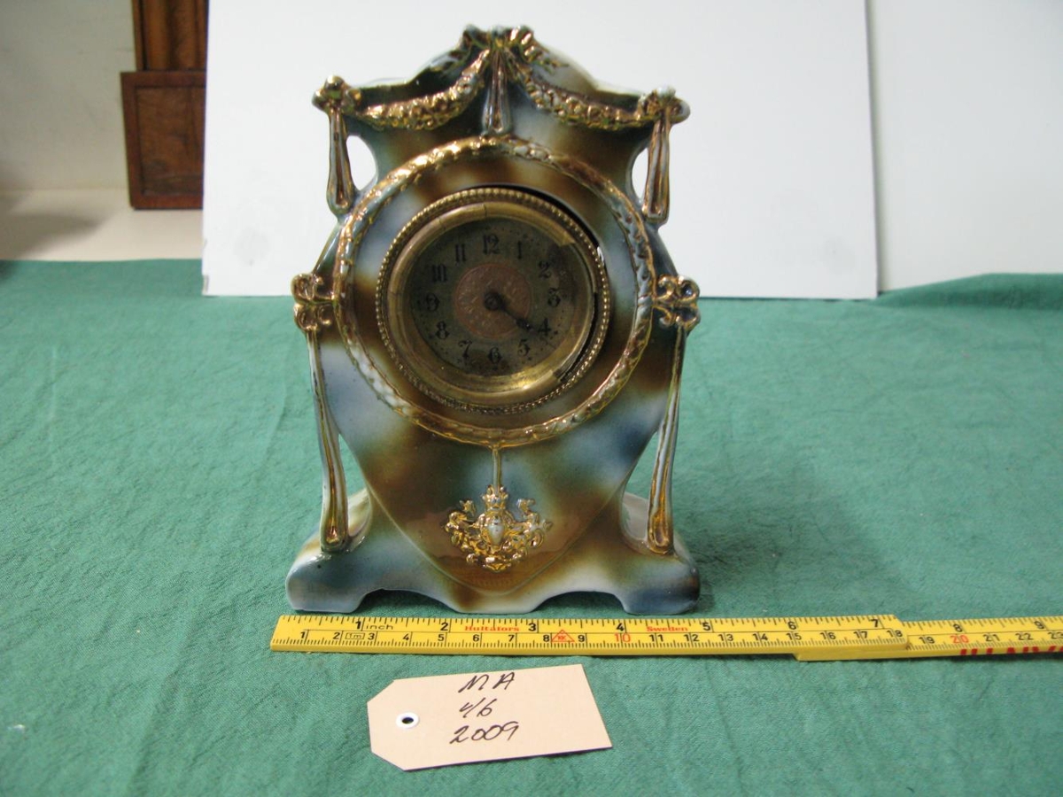 Borðklukka úr postulíni. Glerungurinn er bláskýjóttur og með brúnum flekkjum. Gylling er framan á klukkunni og kringum verkið. Klukkunni var bjargað úr brunarústum Alþýðuskólans á Eiðum, (hann brann 1960), af Ara Sigurbjörnssyni í Gilsárteigi. Ari og Bergrún bjuggu þá í Gilsárteigi en fluttu í Egilsstaði 1965.