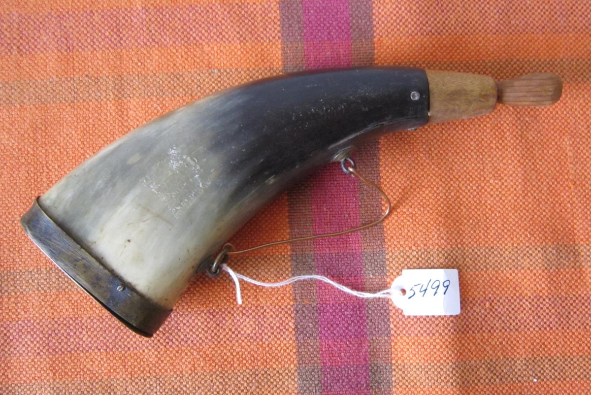 Púðurhorn smíðað úr horni af nautgrip, stútur og tappi úr tré, botn úr kopar, á honum eru stafirnir GB. Mesta lengd 20,5 cm.