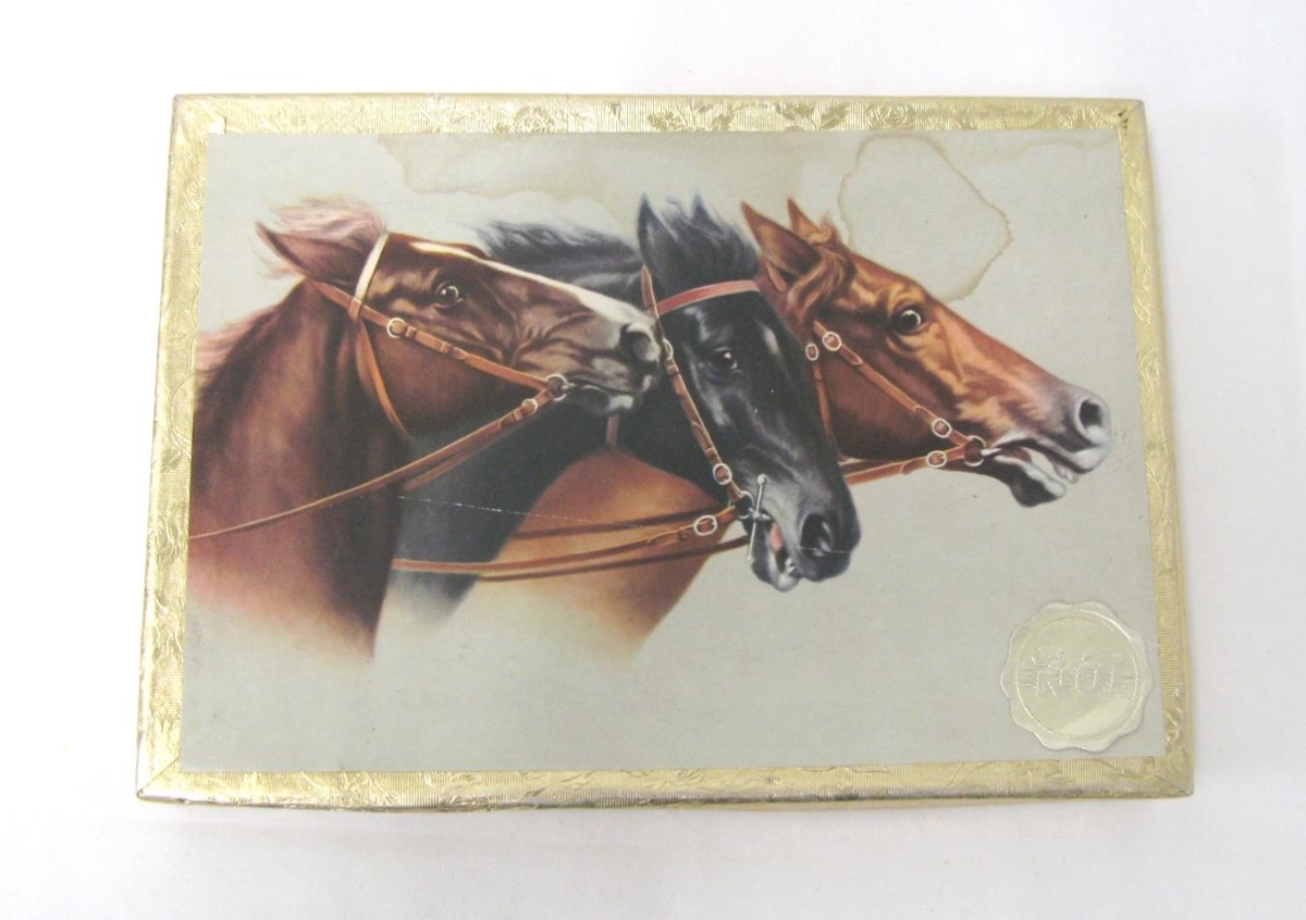 Gyltur kassi frá Nóa, með þremur hestum á. Kom frá Pálínu Waage, Seyðisfirði.
