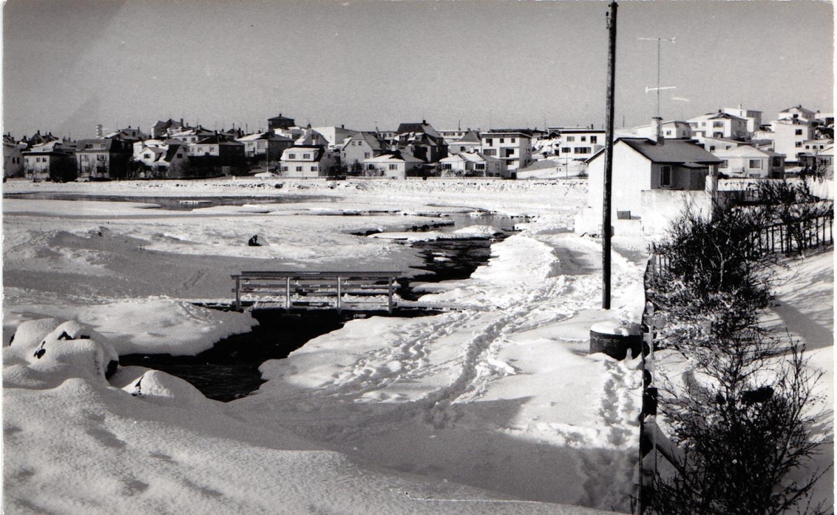 Hafnarfjörður um vetur. Hamarskotshamarslækur, Hörðuvellir fremsta húsið til hægri á myndinni.