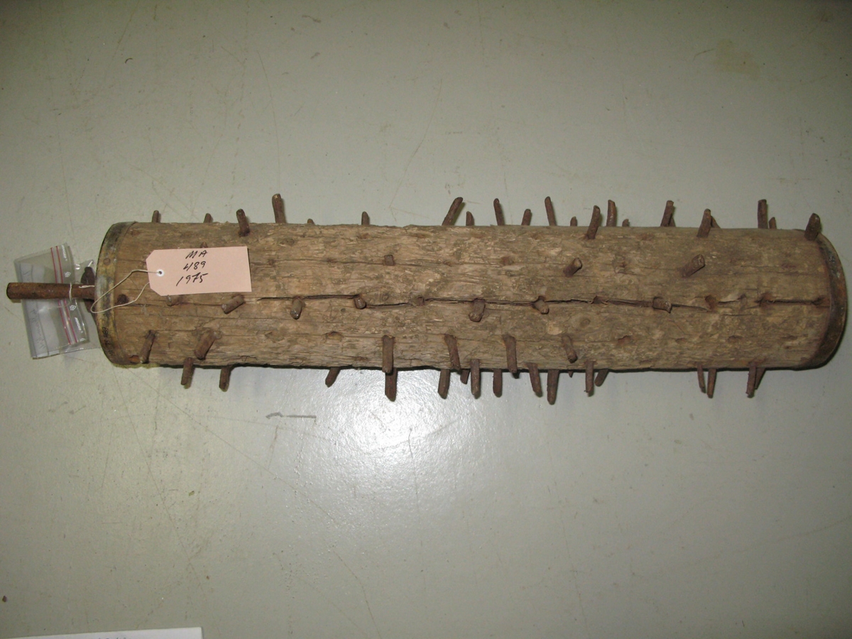 Kall úr taðkvörn. Sívalur trjádrumbur með járngöddum og sveif úr járni. Járnið farið að ryðga.