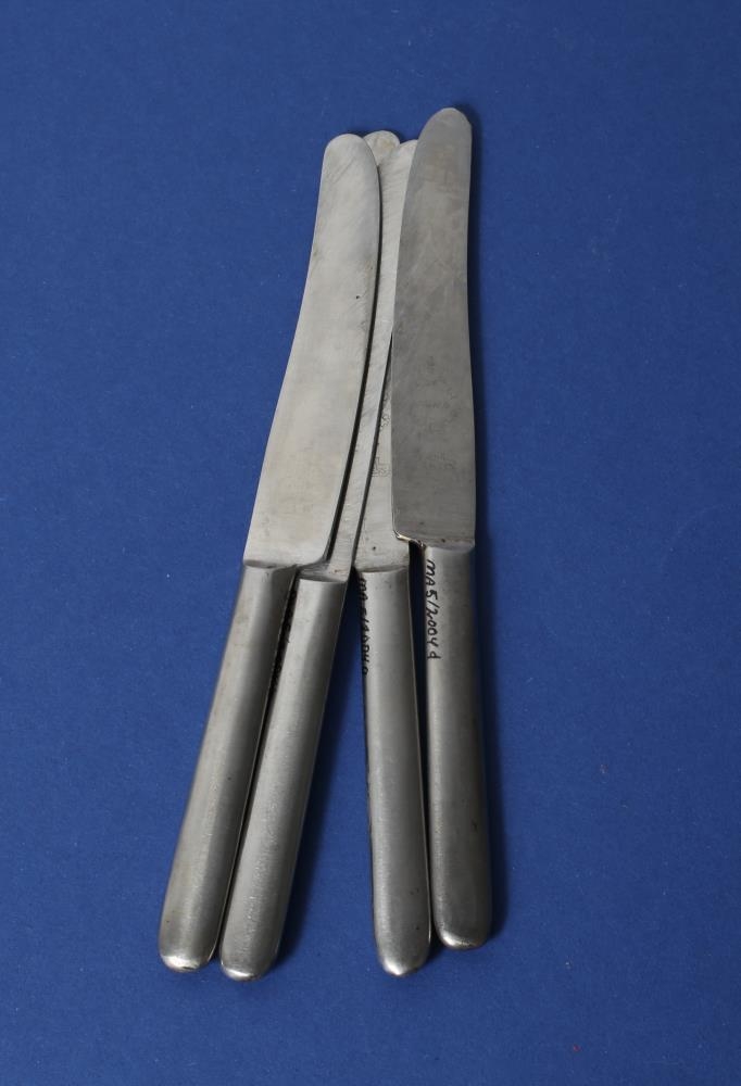 Fjórir borðhnífar úr málmi (merktir: a, b, c, d). Fundust á eyðibýlinu Breiðalæk á Jökuldal. Ábúandi á Breiðalæk 1937-1984 var Jónas Sigurgeirsson(1904-1984). Framleiðandi: Sheffield. Made in England.