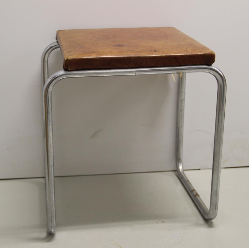 Stóllinn er kollur með stálfótum og sætið er með rauðu skinni frá Skinnaverksmiðjunni Iðunni á Akureyri.