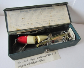 Kassi með þrem spúnum með þríkrækjum, kassinn er grænn, stærð 15,5 x 6 x 4 cm. Í aðfangabók stendur að í honum séu að auki tvö minnó (e. minnow), sem vantar. Kassinn er undan áhöldum til að gera við lekar vöðlur.