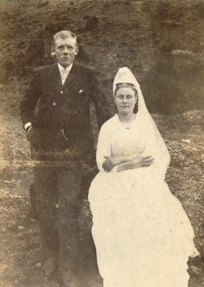Brúðkaupsmynd frá árinu 1895 af Guðmundi Þorbjarnarsyni og Ragnhildi Jónsdóttur Hvoli í Mýrdal..