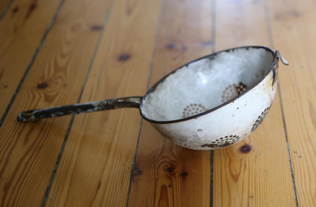 Hvítt og blátt, emelerað sigti. Orðið ryðgað og götótt umfram það sem á að vera. Úr búinu á Droplaugarstöðum. Kom þangað með Agnesi Pálsdóttur frá Ási í Fellum um 1942.