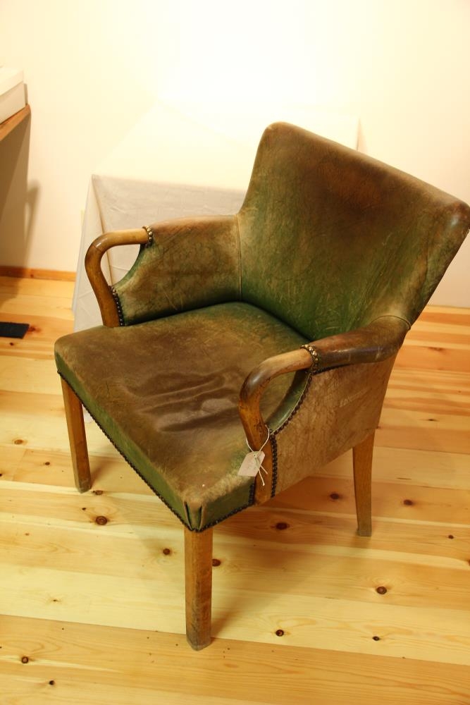 Stóllinn er úr eik og klæddur grænu skinni frá skinnaverksmiðunni Iðunni á Akureyri. Þessi stóll var leðurklæddur í kynningu hjá versluninni Gefjun- Iðunn í Reykjavík árið 1949. Var stólinn síðar lengi á skrifstofu Harrys Frederiksen framkvæmdastjóra Iðnaðardeildar SÍS.