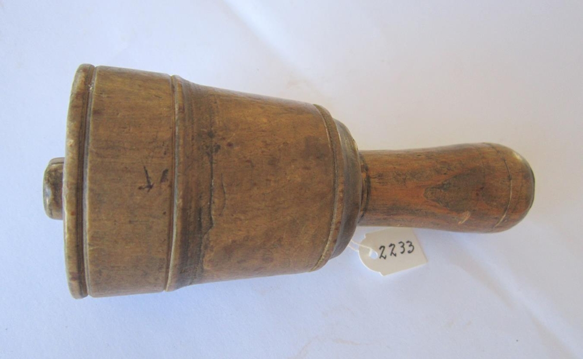 Hleðslustokkur, renndur úr tré, hæð 14 cm Lítur fljótt á litið út líkt og bjalla, ástand gott,en mikið handfjatlaður.