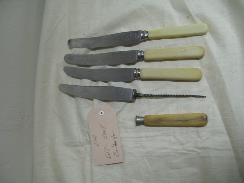 Fjögur stykki hnífar með ljósu plastskafti. Einn hnífurinn er laus í skaftinu en það hefur verið smíðað úr hreindýrshorni.