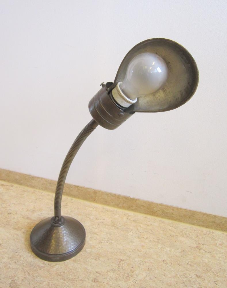 Borðlampi á sveigjanlegum armi, koparlitur, hæð uppréttur 53 cm, snúru vantar. Fóturinn er mjög þungur, sennilega steypujárn innan í.Lampinn er úr eigu Hervalds Björnssonar skólastjóra.