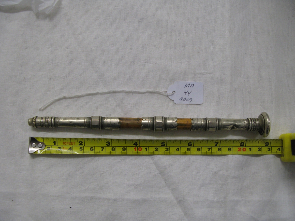 Silfurbúið svipuskaft með ljósum við í millistykkinu. "SA" er grafið á endann sem kringlóttur. "SA". Er úr dánarbúi Ara Sigurbjörnssonar og Bergrúnar Jóhönnu Ólafsdóttur. Gunnþóra Guttormsdóttur, móðir Ara, var fósturdóttir Sigríðar Árnabjörnsdóttur og Gunnars Pálssonar frá Ketilsstöðum á Völlum. SA eru upphafsstafir Sigríðar.