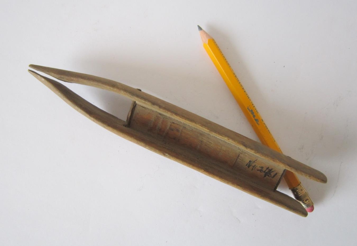 Netanál úr tré 17 cm löng, smíðuð af Ara Guðmundssyni verkstj hjá Vegagerðinni.