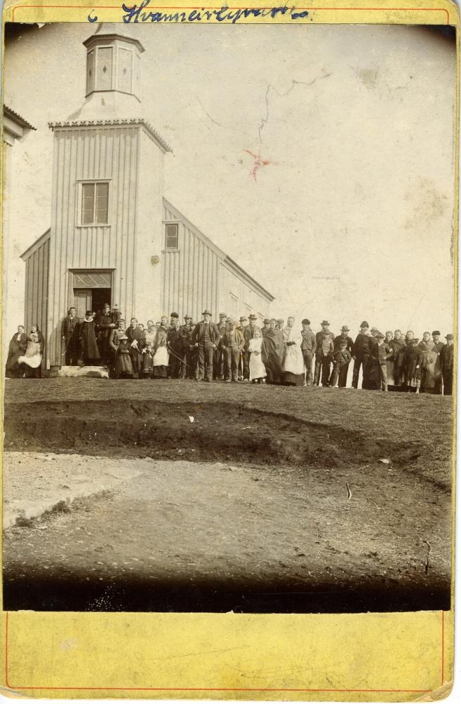 Kirkjugestir stilla sér upp til myndatöku við Hvanneyrarkirkju. Á bakhlið er stimpill ljósmyndara: Sigfús Eymundsson.