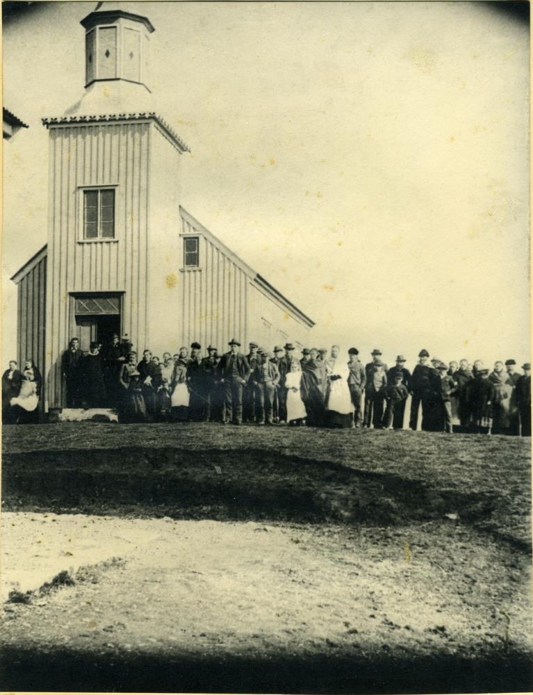 Kirkjugestir stilla sér upp til myndatöku við Hvanneyrarkirkju. Stækkun eftir Lpr-2010-422-1. Sjá nánar þar.