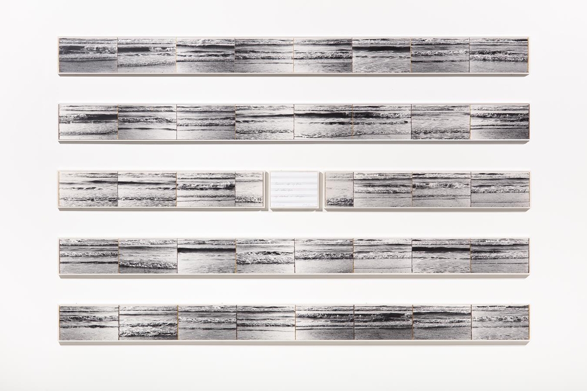 Hreinn was one of the founders of the SÚM group, established by young artist in 1965, which went on to play a crucial role in the development of avant-garde art in Iceland in the 1960s. Hreinn‘s works often reference music and musical language, indicating that he wishes his art to be viewed in an open, lyrical manner. The word overture has several meanings: it can signify an opening, a gap, and also a musical prelude, especially to an opera. In the Romantic period overture acquired the specific meaning of a short independent musical composition, generally in one movement. The tideline on the seashore, with rising and falling tides at morning or evening, may perhaps be seen as a prelude to something longer or bigger, such as a day or an ocean. By presenting the work in five long rows of photographs, the artist is clearly referencing the idea of sheet music, the movement of the tide evoking musical notation.