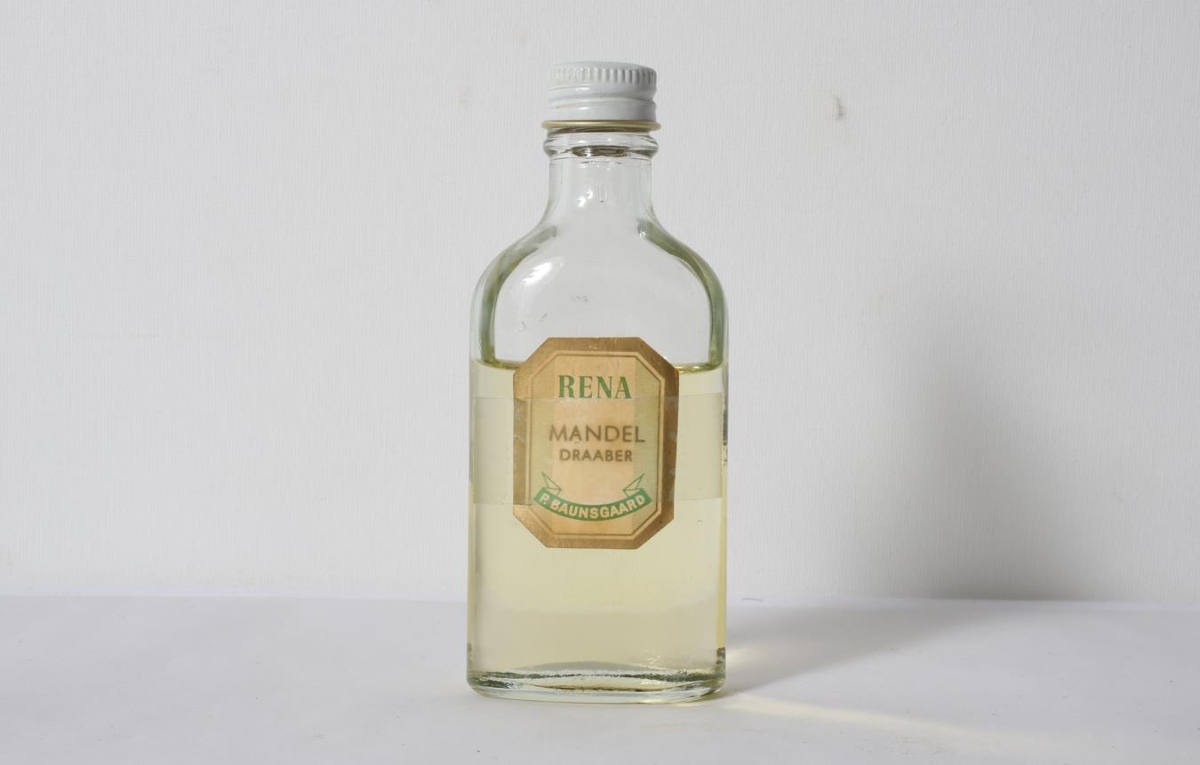 Glerflaska með hvítum málmtappa, hálffull af möndludropum. Lítill miði sem hefur losnað af og er haldið á með gúmmíteygju. Á honum stendur "Rena Mandel Draaber, P. Buunsgaard". Úr búi móður gefanda, Kristínar Gissurardóttur (f.15.3.1921), Hjarðarhlíð 9, Egilsstöðum.