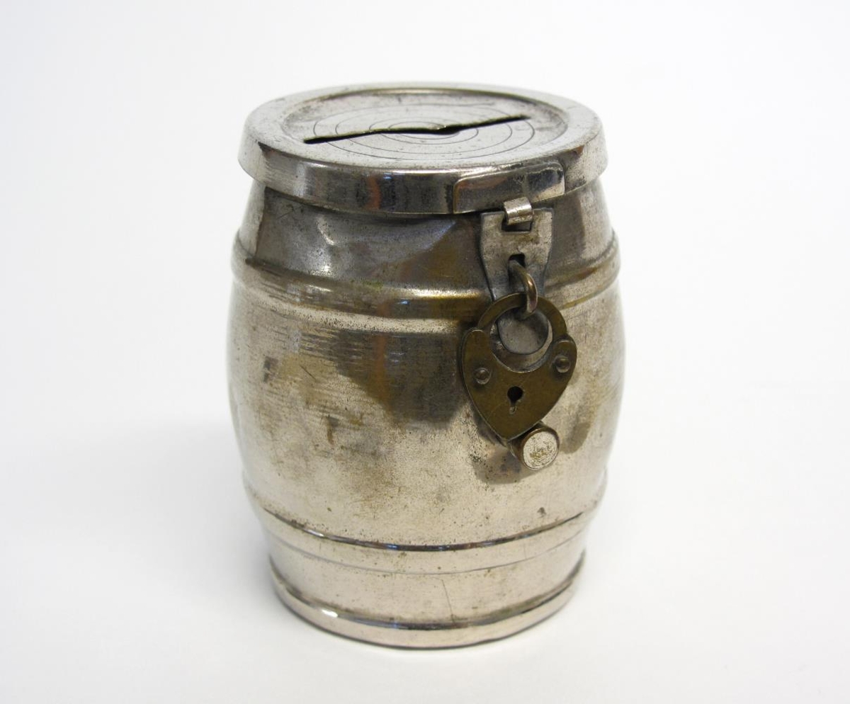 Lítill peningabaukur úr krómuðu látúni. Hann er tunnu- eða ámulaga, með loki að ofanverðu og læstur með litlum koparlási. Lykillinn að lásnum er glataður. Á hlið tunnunnar er kopartappi. Í bauknum er einn smápeningur. Baukurinn er í góðu ástandi þó hann sé eilítið máður og með smábeyglum hér og þar.